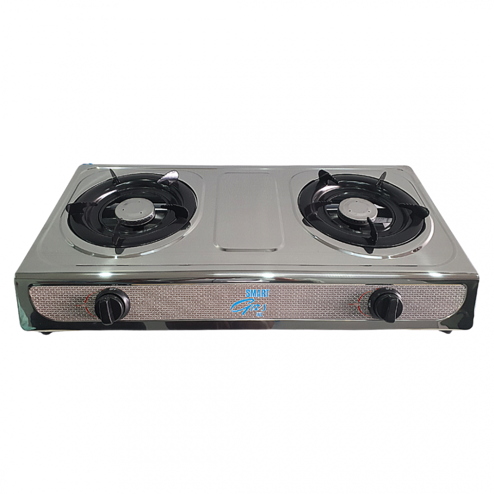 Gas stove with 2 burners, including hose and regulator.