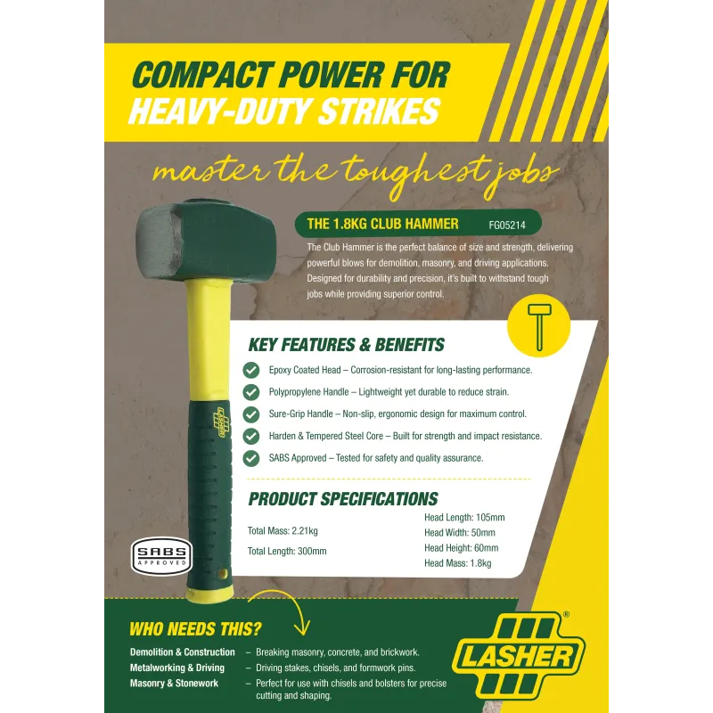 General Purpose Versatile Hammer, Ideally Used With Bolsters And Chisels. General Purpose Versatile Hammer, Ideally Used With Bolsters And Chisels. Epoxy Coated; Poly Sure Grip Handle; Carbon Steel Heat Treated; Steel Core Handle With Soft Pvc Grip; 1.8Kg; Sabs Approved. Working Surfaces Are Hardened And Tempered For Durability And Safety. Striking Faces Are Ground And Polished.